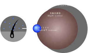ナノミストは、1μm(0.001mm)以下の粒子サイズにした美容液で、髪の毛の約80分の1の微小な粒子がドライヤーから髪に浸透します。