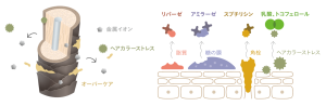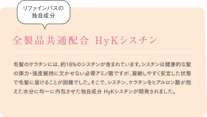 タカラベルモントの先進テクノロジーのひとつである高浸透技術により、毛髪内組成を再現した独自成分 HyKシスチン(毛髪補修・保湿)をヘアメデュラ(毛髪芯部)まで張り巡らせ、内部でゲル化することで定着させます。密度感のある潤い、しなやかな強さが持続します。